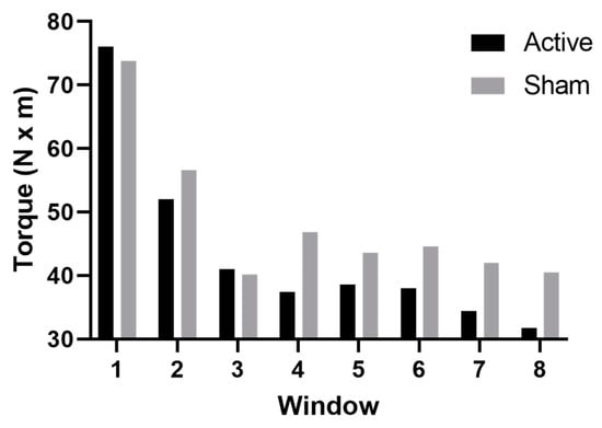 Average torque during the FT divided into 8 time windows in a representative subject during active (black) and sham (grey) stimulation when estrogen levels were high. The bars represent the average torque calculated for each time window.