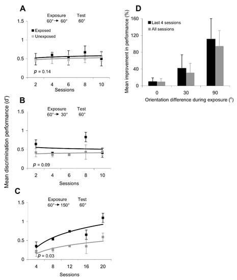In the visual system, practice learning is known to gradually improve the capacity of human subjects to detect small changes in a variety of simple stimuli, ranging from simple visual attributes, such as orientation, position, and motion [8,9,10,11,12,13,14], to complex stimuli, such as shapes and texture [15,16,17]. A key characteristic of this improvement is stimulus specificity. That is, the improvement in performance is typically restricted to stimuli that are similar to those present during training, with transfer to similar stimuli presented in a different context under certain conditions (appropriate tasks and parameters [9,10,11,13,14,18,19,20]. Perceptually, short-term exposure (seconds to minutes) to a fixed oriented grating has been shown to improve orientation discrimination performance around [21,22] and orthogonal ([21,23], for effects induced by brief adaptation) to the adapting orientation, and impair discrimination performance at intermediate orientations [21]. However, whether the orientation discrimination performance changes systematically across days of exposure has never been examined.