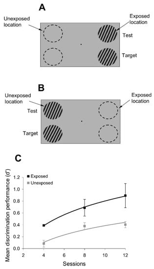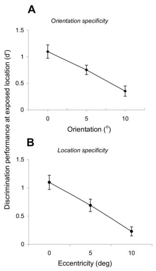 We further examined the degree of specificity of exposure learning by testing whether it depends on retinal position and orientation. Such dependency is a distinct feature of the perceptual learning of elementary features [9,10,13,14,31,32] and argues for the involvement of early and mid-level visual cortical areas in mediating perceptual learning as these areas are known to represent stimulus features with the finest resolution. Figure 4A,B reveals a high degree of orientation and position specificity of exposure learning. Indeed, the orientation discrimination performance at the exposed location (d’) gradually decreases as a function of increasing difference between the test and exposed orientations (Figure 4A; p < 0.01, Student’s t-test). Furthermore, the exposure-induced learning effects are spatially localized—Figure 4B shows that the orientation discrimination performance decreases as the eccentricity at which the orientation discrimination is performed increases (p < 0.01, Student’s t-test). Thus, exposure learning retains the position and orientation specificity of task-related practice learning.