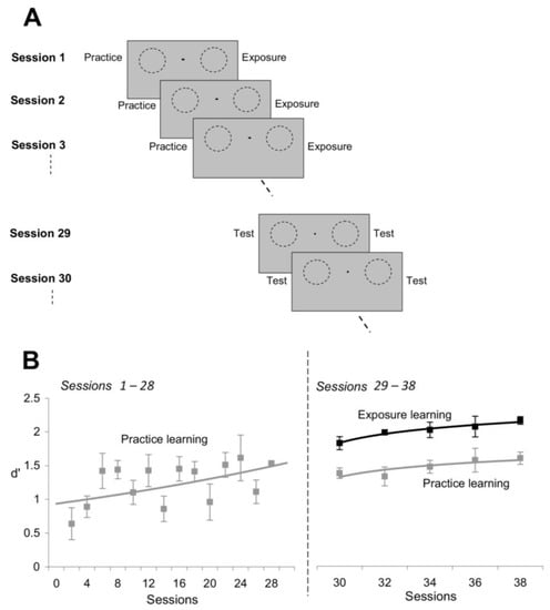 Exposure learning develops more rapidly than practice learning. (A) Experimental design. Subjects were required to experience practice learning at one location (left visual field) and exposure learning at another location (right visual field) for the same number of sessions (sessions 1 through 28). In sessions 29–38, orientation discrimination performance was measured at both exposed and unexposed locations to directly compare the effects of practice and exposure learning. (B) Exposure learning was stronger and developed more rapidly than practice learning. Black line: discrimination performance (d’) at the exposed location (exposure learning); gray line: discrimination performance at the unexposed location (practice learning). Error bars represent SEM.