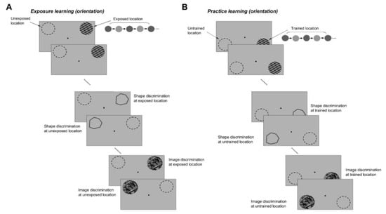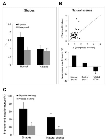 Generalization is a key property of learning and is defined as a transfer of the improvement in perceptual performance achieved through training to new stimuli. Classical perceptual learning theories postulate the specificity of learning for the simple stimuli present during training, such as stimulus position and orientation, with little or no generalization to more complex stimuli. Indeed, there has been little evidence that practice learning leads to improvement in discrimination performance beyond the local stimulus configuration during task practice [9,13,15,18,19,20,32]. Given the importance of the generalization issue, we examined whether the improvement in orientation discrimination performance at the exposed location leads to improvement in the discrimination of complex shapes composed of orientation signals around the experienced axes, and then compared the degree of transfer of exposure and practice learning. Based on the rapid rate of acquisition of exposure learning (Figure 5), we expected that the discrimination of complex stimuli, such as shapes and natural scenes, would be improved more after repetitive exposure to orthogonal orientations, than after repetitive practice of orientation discriminations.