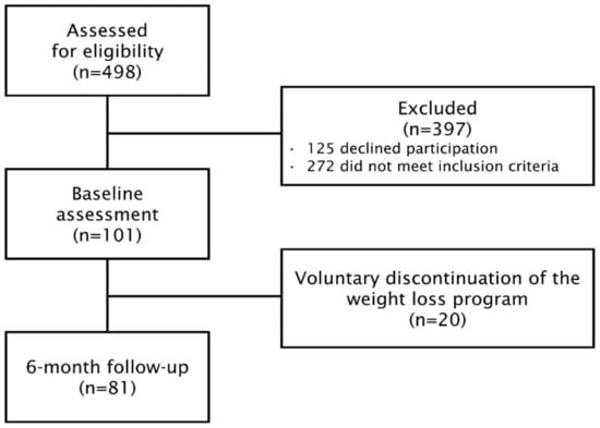 Among 498 patients screened for potential participation in our longitudinal cognitive assessment program, 101 individuals met the inclusion criteria, and 81 completed the weight loss program and the cognitive evaluations (72% women and 92% men) (Figure 1).