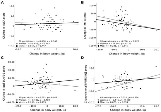 No significant correlation was found between weight loss and the change in global cognition evaluated, with MoCA and EF evaluated with BANFE-2 and BANFE-NQS. Nonetheless, there was a mild negative correlation (i.e., improvement) between TMT-B and weight change (Figure 2).