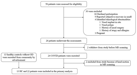 A total of 13 healthy adults (age: 45.0 ± 13.2 years old, 7 females/6 males), and 24 COVID-19 patients (age: 43.6 ± 14.0 years old, 14 females/8 males) who presented with persistent (≥3 months) COVID-19-related OD were recruited (Figure 1).