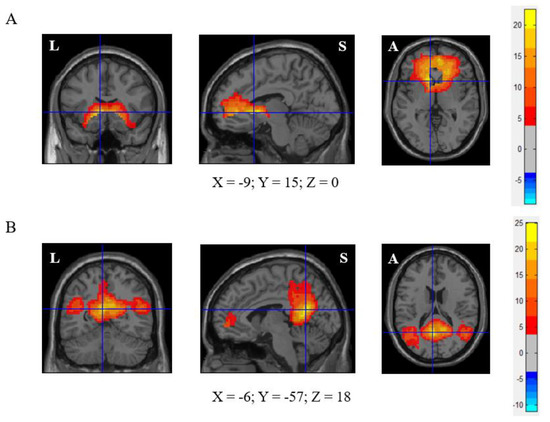 Olfactory network (ON) and default mode network (DMN) of this cohort. (A) ON (left caudate nuclei (−9, 15, 0) as seed), (B) DMN (left precuneus (−6, −57, 18) as seed). FDR correction, p < 0.05, voxel size > 2700 mm3.