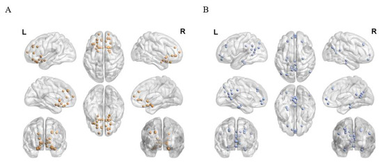 Subsequently, the sample-specific component map was applied as the template for its corresponding brain network. Based on Automated Anatomical Labelling (AAL) anatomic parcellation, we obtained 31 ROIs in the ON (coordinates of peak t values in ON regions, sphere radius = 6 mm) (Figure 3A and Table S1) and 37 ROIs in the DMN (coordinates of peak t values in DMN regions, sphere radius = 6 mm) from the above-mentioned z-score maps (Figure 3B and Table S2).