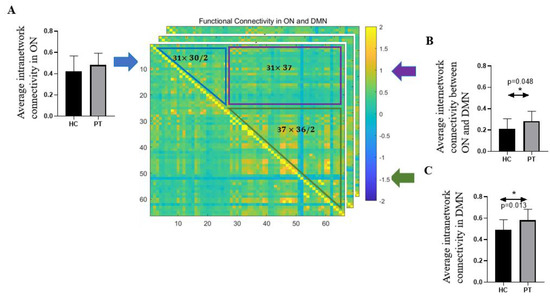 Schematic representation of the comparison of average intra- and inter-network connectivity in ON and DMN between COVID patients and healthy adults. Each subject has a 68 × 68 functional connectivity matrix. The values in the blue triangle indicate the correlation coefficients between pairs of the 31 regions within the ON, and in the green triangle represent the functional connectivity between the corresponding regions in DMN (37 regions). Voxels in the purple rectangle illustrate the functional connections between regions in ON and regions in DMN. In healthy control and patients, the comparison of (A) average intranetwork connectivity in ON; (B) average internetwork connectivity between ON and DMN and (C) average intranetwork connectivity in DMN. (Error bar shows the standard deviation of measurements, * indicates that p < 0.05).