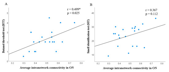 In addition, the correlation between the BTT score and the average intranetwork connectivity in the ON demonstrated a significantly positive correlation (r = 0.499 *, p = 0.025), which could indicate a relationship between clinical olfactory performance and intranetwork connectivity in ON (Figure 5A). No significant correlation was found between the SIT score and the average intranetwork connectivity in ON (r = 0.367, p = 0.112).