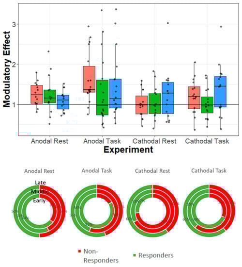 Patterns of responders and non-responders across the four TMS-EEG studies from our lab. The upper panel represents the interindividual variability of the modulatory effects of tDCS in early (0–50 ms), middle (50–100 ms), and late (100–150 ms) latency TEPs components, represented by the pink, green, and blue boxes, respectively. The effect was computed by dividing post-tDCS by pre-tDCS local mean-field power values so that values above 1 represent an increase in post-tDCS response. Cathodal results are reversed for graphical reasons. The bottom panel represents the percentage of responders (green) and non-responders (red) calculated as participants showing the outcome modulation of at least 20% of the pre-tDCS values on early, middle, and late TEPs components, represented by the inner, intermediate, and outer circles.