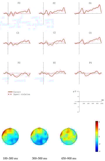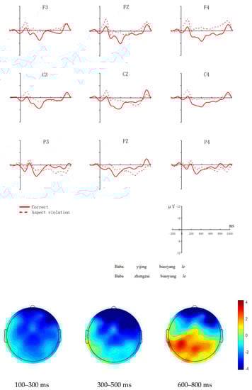 Zhang and Zhang [] conducted an ERP study on Mandarin Chinese grammatical aspect for Chinese native speakers, as shown in sentence (4). The results showed that in the time window of 200–400 ms, the aspect violation sentence elicited a posterior and left central negativity, followed by a P600. The authors argued that this negativity (200–400 ms) may reflect the failure of matching the aspect marker with the time adverb in the sentence, or the detection errors of aspect violation. The subsequent P600, however, represented syntactic repair or monitoring and processing of violations caused by aspect inconsistency. The above findings were partially repeated in a follow-up study, in which the aspect violation between the Mandarin Chinese aspect marker “guo” and time noun led to a pronounced P600 [].