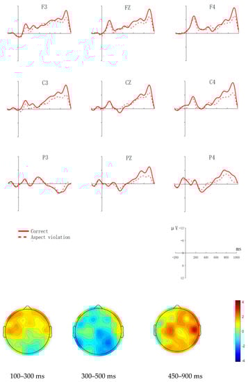 In the 300–500 ms window, the model comparison showed a significant main effect of condition (χ2(1) = 12.242, p < 0.001), with larger ERP responses for aspect violation sentences than for correct sentences (β = −2.695, SE = 0.770, z = −3.503, p < 0.001). The interaction effect between electrodes and condition was not significant (χ2(2) = 0.201, p = 0.904). In the 450–900 ms time window, there was a marginally significant two-way interaction between condition and electrode (χ2(2) = 4.847, p = 0.089), and the post hoc comparison suggested that the ERP responses evoked by aspect violation sentences were larger than those evoked by correct sentences at CZ (β = 2.812, SE = 1.322, z = 2.370, p = 0.025) and at FZ (β = 3.234, SE = 0.873, z = 3.325, p = 0.018).