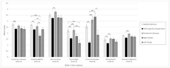 Mean scores at each NADL-F short subtest across all of the groups. The maximum score that can be obtained for each subtest is reported in parentheses. Error bars show standard errors of the means. Asterisks represent significant differences (* p < 0.01; ** p < 0.001).