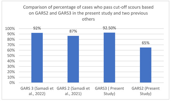 A similar pattern was seen in two other studies using the second and third versions of GARS in the area; data extracted from these studies and compared with the present study indicated revealed this pattern. Five hundred and ninety-four individuals out of a group of 601 individuals with three types of developmental disabilities using GARS-3 [41] past the cut-off score for ASD. While in another study with GARS-2, 536 children out of a group of 623 children with different types of developmental disabilities past the cut-off score. Figure 2 depicts this pattern in the present and two other previous studies.