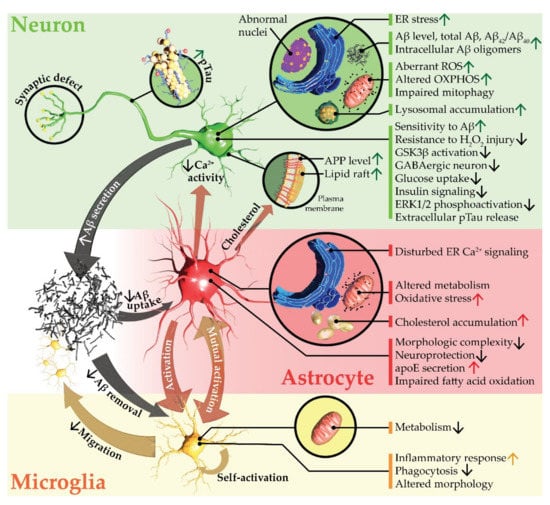 Regardless of the aforementioned difficulties, the importance of astrocytes in the pathogenesis of AD was demonstrated in the HiPSC-derived cocultures of patients with early-onset FAD where astrocytes exhibited altered metabolism, increased oxidative stress, and disturbed Ca2+ signaling in the endoplasmic reticulum [74,75]. In line with AD-related defects in neuronal lipid metabolism [76], 2D astrocyte cultures from patients with FAD showed impaired fatty acid oxidation [77], altered morphology [78], and nonstimulated release of soluble inflammatory mediators [78]. Fatty acid oxidation impairment in 2D astrocyte cultures was corrected by synthetic peroxisome proliferator activated receptor-β and -δ (PPARβ/δ) agonist GW0742 [77]. PPARβ/δ is a key player in brain energy homeostasis and metabolism. Further studies showed that, in astrocyte-neuron cocultures, these astrocytes provide reduced support towards neuronal survival and synaptogenesis, exhibit reduced glucose uptake [79,80], and oversupply cholesterol to neurons causing neuronal lipid raft expansion and Aβ42 production [81]. Altered bioenergetic metabolites and transcriptomes were also reported in these astrocytes [80].