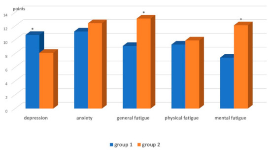 Patients’ affective range and fatigue were assessed using the Hospital Anxiety and Depression Scale (HADS) and the MFI-20 Scale. The data analysis indicated depression to be a clinically relevant factor with significantly higher prevalence in Group 1 patients (10.7 ± 1.7 points, “subclinical depression”) compared to Group 2 (8.1 ± 1.5 points) (p = 0.00001). The anxiety levels in both groups were higher than 11 points and corresponded to “clinically severe anxiety.” Fatigue assessment on the MFI-20 scale revealed a high level of general (13.1 ± 2.4 points) and mental (12.1 ± 2.6 points) fatigue in Group 2 patients (Figure 2).