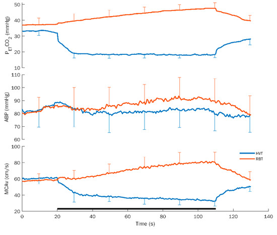 Average response curves for hyperventilation (HVT) and rebreathing (RBT) with standard deviation for the different variables. PETCO2: partial pressure of end-tidal CO2; ABP: arterial blood pressure; and MCAv: middle cerebral artery flow velocity. The black bar at the bottom indicates the duration of the task. Note the opposite effects on each variable exhibited by the HVT and RBT.