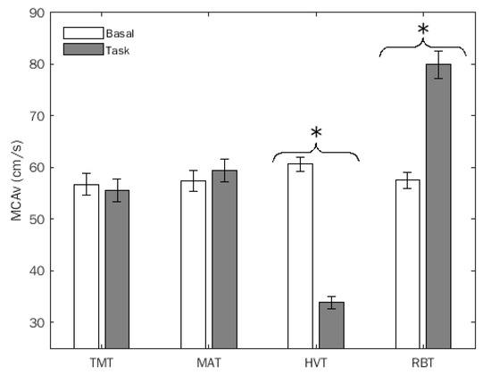 Since MCAv did not exhibit significant differences between basal and experimental conditions in TMT and MAT, further analyses were conducted only on HVT and RBT.