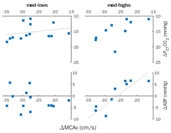 Hyperventilation (HVT). Within-group correlations between changes in middle cerebral artery flow velocity (MCAv), partial pressure of end-tidal CO2 (PETCO2), and arterial blood pressure (ABP) in med-lows and med-highs. Trendlines indicate significant correlations.