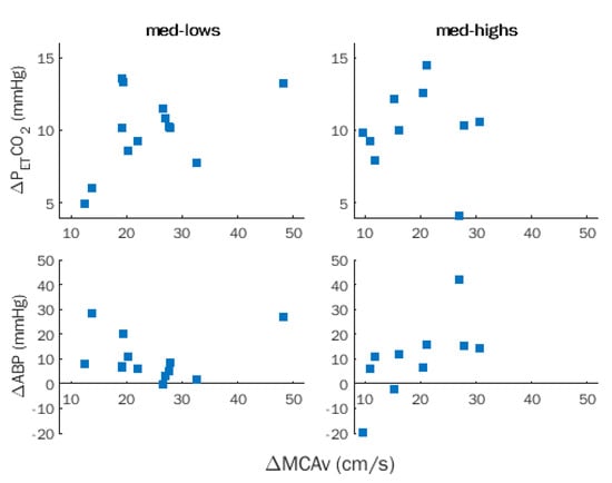 The absence of significant ABP changes during HVT does not allow us to exclude that the observed non-significant ABP decreases may have influenced the med-highs’ changes in cerebral blood flow ΔMCAv. An opposite behavior occurred in med-lows, who exhibited a significant association between ΔMCAv and ΔPETCO2, indicating a preferential control of MCAv by chemical stimulation.