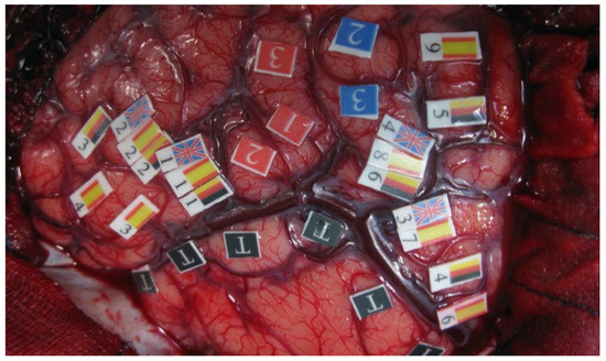 An intraoperative view of the window exposed by a left frontoparietotemporal craniotomy. Red numbers (1–2–3) represent the motor stem on the precentral gyrus. Blue numbers (2–3) represent the sensory stem on the postcentral gyrus. The areas marked with flags represent those regions in which language disturbances were elicited during the direct cortical stimulation, either specific to one language or shared among several of them. We can see at the ventral premotor cortex that it is being shared by English, German, and Spanish.