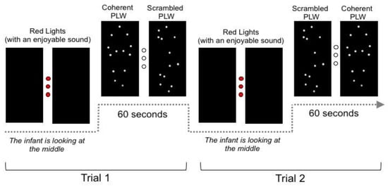 A schematic representation of the procedure in Experiment 1. Red lights were displayed at the beginning of each trial to attract infant’s attention to the middle of the screens. Only then, the experimenter triggered the beginning of the stimuli, and the coherent and scrambled point-light walkers (PLWs) were presented simultaneously for 60 s. Infants participated in a total of 6 trials.