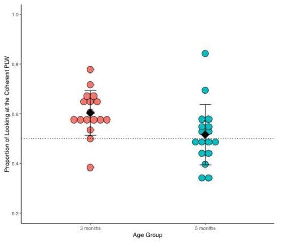 Proportion of looking at the coherent point-light walker (PLW) in Experiment 1 at three and five months of age. Each dot represents the proportion of looking at the coherent point-light walker for an individual subject. Three-month-old infants are denoted by orange dots (n = 17), and blue dots denote five-month-old infants (n = 17). Mean group proportion per age group is represented by the black diamonds and the black bars denote 1 +/− standard deviation of the mean. The doted horizontal line marks the 0.50 proportion, (i.e., equal looking at both stimuli) and no preference.
