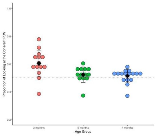 In our first hypothesis, we consider that different attentional processes in the two age groups could have mediated the differential preferential responses to the stimuli in the task. Three-month-old attention is more exogenous or stimulus driven, that is, more controlled by the external characteristics of the stimuli; however, at five months, infants gain a more endogenous control of their attention and are internally directed [58,59]. Thus, it could be that three months’ selective attention in our study was driven by the “low-level” visual features of the coherent point-light walker (such as the depiction of configural coherence or a vertical symmetry), whereas the older infants, likely less controlled by these salient visual features of the coherent stimulus, engaged in a more “exploratory” looking behavior, thus, switching their looks between the two stimuli—see Figures S1 and S2 of the Supplementary Materials for a visualization of the looking patterns of infants at the two age groups.