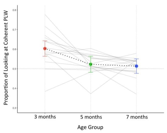 We fitted our longitudinal data for mean proportion of looking at the coherent point-light walker, with a linear mixed-effect model. Data were modeled using the nlme package in R [54] using age in months (3 levels) as a fixed effect and a subject-level intercept as a random effect—see Figure 4 to see the model estimates over the three time points.