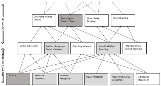 Figure 1 presents a partial enablement model of early MCS functional abilities in schematic form. The vertical axis represents increasingly complex functions as defined by the ICF, with basic body functions at the bottom, combining into simple and somewhat more complex activities in the upper rows. The arrows indicate the causal importance of multiple lower functional abilities on each higher one, with dotted lines at the top indicating causal influences on still more complex activities and aspects of participation. Enablement theory is concerned with the relative “causal weights” of these arrows. For example, an impairment in auditory perception might have a more profound effect on auditory language comprehension than on verbal expression. Visual perception and extraocular movements may both contribute to visually guided reaching, but perhaps visual perception is more critical (i.e., has a higher weight). Importantly, treatments that are successful in enhancing functioning as represented by one of these boxes (e.g., dark-shaded “arousal”) may not have an impact at higher levels (e.g., dark-shaded “reaching for named objects”) because of additional untreated functions (e.g., the several light-shaded functions) that are necessary for the functional performance in question, and which may, depending on the patient, also be impaired.