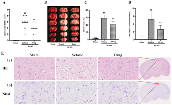 Nuciferine protected brain against middle cerebral artery occlusion. (A) Scatterplot of neurological deficit scores at 24 h after MCAO (sham, vehicle and drug group data were represented by squares, circles, and triangles, data underlined for medians, n = 10). (B) Representative photographs of TTC-stained coronal brain sections that show infarct regions tissue (white) 24 h after MCAO operation. (C) Statistical analyses of the effects produced by nuciferine on infarct volume in TTC-stained sections after MCAO injury (n = 10). (D) Quantitative analyses of rate of cerebral edema after MCAO injury (n = 10). Except for neurologic score, all data were expressed as mean ± SD; ## p < 0.01 compared with sham group; * p < 0.05, ** p < 0.01 compared with vehicle group. (E) Pathological results of brain injury in rats (a) HE staining, (b) Nissl staining.