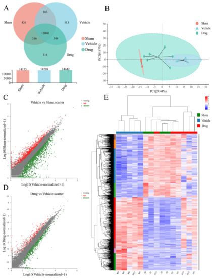 Results of sample relationship analysis and expression analysis. (A) Results of Veen analysis of the three groups of samples. (B) Results of principal component analysis of samples in three groups. (C) Scatter plot of gene expression in brain of rats in sham and vehicle group. (D) Scatter plot of gene expression in brain of rats in vehicle and drug group. (E) Results of cluster analysis of gene expression hierarchy of samples in three groups.