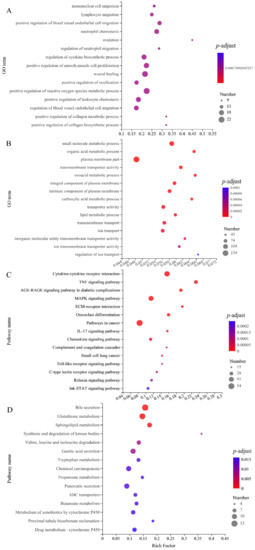 GO function enrichment analysis showed that genes up-regulated by nucleotides were involved in the main biological processes, including monocyte migration, lymphocyte migration, positive regulation of vascular endothelial cell migration, neutrophil chemotaxis and regulation of neutrophil migration. The regulation of cytokine biosynthesis, wound healing, active oxygen metabolism, leukocyte chemotaxis, vascular endothelial cell migration, collagen biosynthesis and metabolism are shown in Figure 3A. The biological processes in which genes down-regulated by nuciferine are involved include small molecule metabolic process, organic acid metabolic process, oxoacid metabolic process, carboxylic acid metabolic process, lipid metabolic process and ion transport, as shown in Figure 3B.