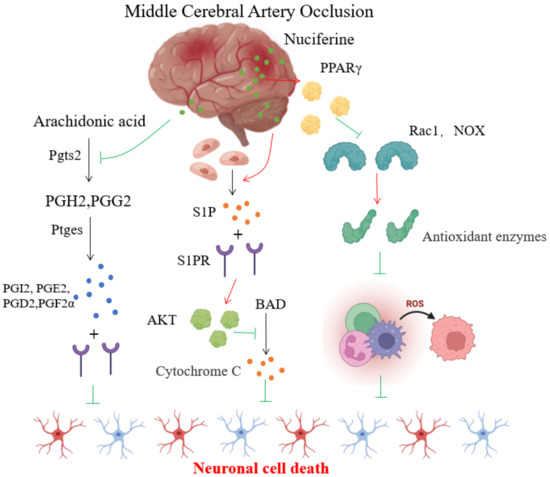 Secondly, according to sphingolipid metabolism, there is much to discuss further. The lipid metabolism pathway regulated by nuciferine also includes the sphingolipid metabolism pathway. Sphingolipids can be synthesizsed by all tissues in the body, with brain tissue being the most active. They are the main component of the membranes of nerve tissue. Phospholipases hydrolyse sphingolipids to produce ceramides, sphingomyelin and 1-phosphatidyl sphingomyelin (S1P), which are directly involved in regulating cell proliferation and apoptosis. Studies have shown that ceramide promotes apoptosis and inhibits cell growth and that S1P is a biologically active sphingolipid metabolite, with the brain being the organ with the highest concentration of S1P [30], and local S1P levels are further increased in MCAO [31]. It was found that in MCAO rats, S1P exerts a protective effect on cerebral ischemia through activation of S1Pl, which is associated with the activation of akt, which plays an essential role in the inhibition of apoptosis [32]. S1P can also induce the proliferation of neuronal cells [30], enhance the tolerance of cortical neurons and endothelial cells to ischemia and hypoxia and counteract ischemia-hypoxia-induced brain cell death. Inhibition of S1P signaling pathway can prevent post-ischemic blood–brain barrier dysfunction [33].