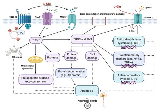 L-Glu exposure resulted in structural damage, such as reduced expression of neurofilament 200 (NF200) protein and a marker of plasticity, polysialylated neural cell adhesion molecule (PSA-NCAM) []. L-Glu also triggered the expression of endoplasmic reticulum (ER) stress markers and other stress response proteins. The expression level of ER stress-related proteins, such as CCAAT/enhancer-binding protein homologous protein (CHOP), glucose regulatory protein 78 (GRP78), and caspase-4, was significantly increased after 10 mM L-Glu addition to SH-SY5Y cells for 24 h []. Additionally, the stress signal 70 kDa heat shock protein (HSP70) was elevated following 0.25 and 0.5 mM L-Glu addition to IMR-32 cells [].