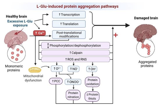 One article that investigated the relation between L-Glu treatment and toxic protein aggregation reported that SH-SY5Y exposed to 1 mM for 6 h resulted in a build-up of tau protein phosphorylation, but this was not statistically significant [].
