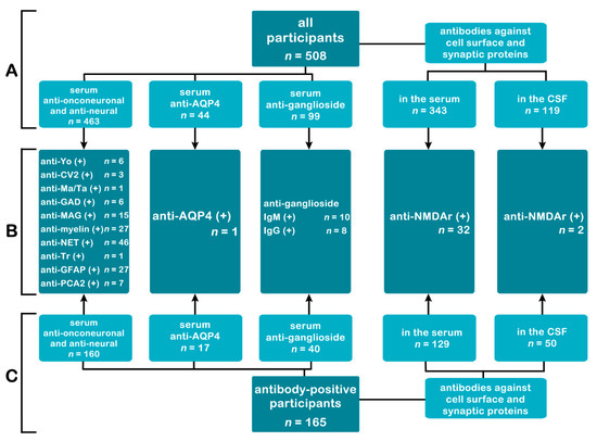 The number of tested patients in subgroups. Part A—the number of patients tested for each group of antibodies in all research participants. Part C—the number of patients tested for each group of antibodies in the antibody-positive subgroup (patients with at least one autoantibody detected). Part B—common to A and C-number of detected antibodies. Abbreviations: anti-Yo—Purkinje cell cytoplasmic antibody type 1; AQP4—aquaporin 4; CSF—cerebrospinal fluid; CV2—collapsin response mediator protein 5; GAD—glutamic acid decarboxylase; GFAP—glial fibrillary acidic protein; Ig—immunoglobulin; MAG—myelin-associated glycoprotein; NET—neuroendothelium; NMDAr—N-Methyl-D-Aspartate receptor; PCA2—Purkinje cell cytoplasmic antigen type 2.