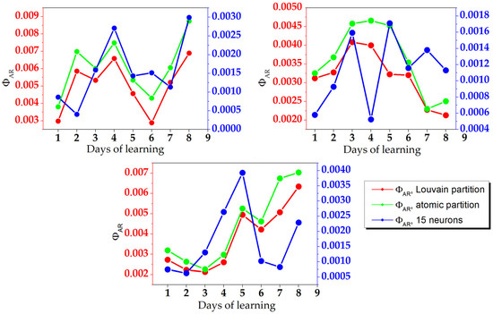 calculated for three animals for each learning day, using three different approximation methods. Left y axis: Louvain partition and atomic partition approximation. Right y axis: 15-neuron approximation.