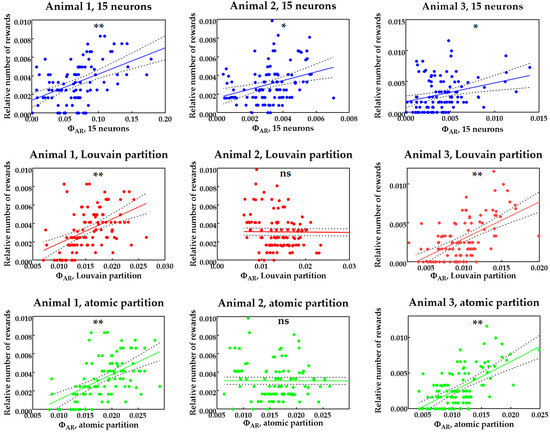 vs. relative number of rewards for each rat in periods, with calculated using approximations with Louvain and atomic partitions on the limited set of 15 neurons. Significance levels are shown according to Bonferroni correction for multiple comparisons (15 checked hypotheses totally): “ns” means the absence of significant correlation (p > 0.05/15 = 0.0034), “*” means ; “**” means .