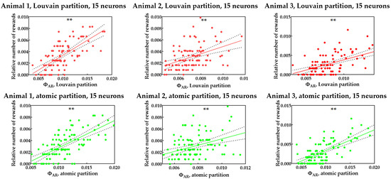 In previous works investigating the integrated information in a brain, the focus of attention is directed to the EEG data—simulated [16], and in vivo in a developing brain [17]. We investigated a possibility of utilization of neural spike data recorded from the individual cells. This improvement significantly helps in the investigation of plastic changes in a brain, because it paves the way to deal with individual cells encoding and processing information, and not with data averaged from multiple neurons, as in the EEG method. This also allows experiments to be performed involving free-behaving animals. We made this calculation with different partitions, extending and generalizing the calculation algorithm. For time-series data, a widely used autoregressive algorithm was applied [19], as in other research with time-series data [17]. Barrett and Seth, in their work about an autoregressive algorithm, make a significant simplification, and limit their work to system bipartitions, i.e., partitions of a system into two parts. In two approximations (atomic and Louvain), we overcame this limit and replaced a bipartition with a partition approximately describing the structure and information processing in a system. We investigated the correlation between Φ and the classical, observable, and task-dependent metric of success (the number of rewards), as performed earlier in non-biological complex systems [10,11]. All previous studies show a trend of increasing during learning [10,17], and/or a correlation between and a system performance metric [10,11,16,17]. In our work, only the second is observed. The rising trend of is not observed. The possible reason for such behavior is that not all of the whole set of neurons involved in task performance were registered, and this part does not change significantly to obtain the trend.