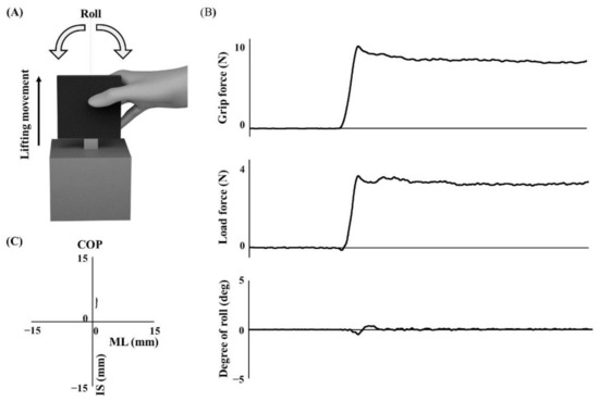 Generally, when a person grasps and lifts an object with a symmetrical mass in a precision grip, the grasping position must be closer to the center of the horizontal plane of the object in order to minimize the object’s roll, and sufficient grip force must be exerted to prevent slipping of the object [9,10,11]. When objects with an identical visual appearance but differing weights are to be lifted, grip and lift forces need to be adapted based on the error information between the sensory feedback and an erroneous programming of force [11]. These sophisticated grip controls provided by the sensory-motor integration in the internal model allow for complex daily activities [12].