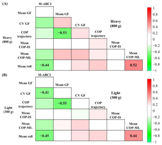 The associations among the children’s M-ABC2 results and precision grip control are presented in Figure 2. In the heavyweight condition, larger grip forces were associated with shorter COP trajectories, and larger mean roll was significantly correlated with a lower M-ABC2 and a higher mean COP-ML. In the lightweight condition, the higher CV was associated with lower M-ABC2, and larger grip forces were associated with shorter COP trajectories. The higher mean roll was also associated with both lower M-ABC2 and higher mean COP-ML.