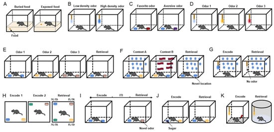 - Aqrabawi, A.; Kim, J. Behavioral Evaluation of Odor Memory in Mice. Bio-Protocol. 2018, 8, e3023. [Google Scholar] [CrossRef]
