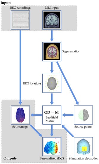 The proposed workflow from MRI and EEG to personalized tDCS can be represented in a flowchart, as shown in Figure 1. The different aspects and steps in the flowchart will be described in the following sections of the paper while putting them into perspective with the state of the art in the field. This has been achieved by analyzing the recent literature via, for example, PubMed searches and recent conference publications regarding neurostimulation. These searches indicate the growing interest and research in the field. The number of publications using tDCS as a keyword grew from 130 in 2010 to 962 in 2020 on PubMed and from 669 to 1945 on ScienceDirect over the same time range.