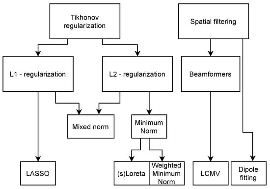Numerous algorithms have been developed over the years to solve this dipole magnitude matrix while coping with the ill-conditioned nature of the problem. The main concepts for the inverse methods can be found in Table 3, which serve as the basis for more customized or specific algorithms, for which the solutions are given in Table 4. The relation between the concepts in Table 3 and the solutions in Table 4 can be seen in the methods family tree depicted in Figure 3. The overview is based on comparisons between algorithms and reviews found in the literature [,,,,]. Each method is referenced in the table entries. The overall characteristics of the main algorithms is that they try to minimize Equation (1) with respect to a norm, with different options for regularization, using parameter . In the more specific algorithms (see Table 4), denotes an arbitrary weighting matrix, is a specific weighting matrix based on the columns of , is the discretized Laplacian operator, represents the electrode locations, represents the dipole locations, and is the data co-variance matrix.