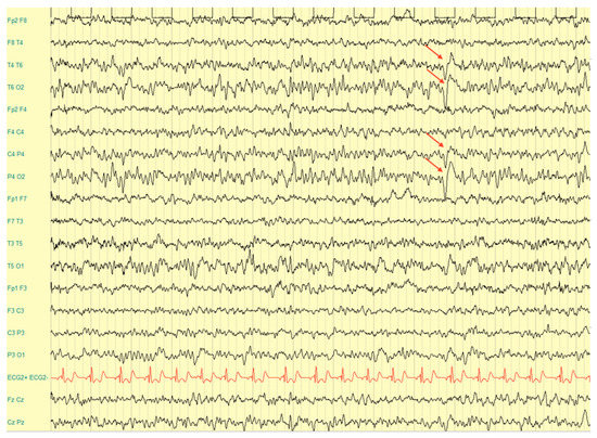 Blood tests (blood count, electrolytes, creatinine, urea, glucose, bilirubin, aspartate aminotransferase, alanine aminotransferase, gamma-glutamyl transpeptidase, albumin, cholesterol, triglycerides, lactate dehydrogenase, creatine phosphokinase, fibrinogen, thyrotropin, free thyroxin, free triiodothyronine, and C reactive protein) had values within the normal range. The interictal electroencephalogram (EEG) showed slow and sharp waves in the parietal, temporal, and occipital regions prevalent on the right side during sleep and wakefulness, with a sporadic tendency to diffuse (Figure 1). Treatment with Valproic Acid (15 mg/Kg/die) was therefore started.