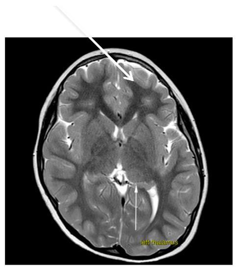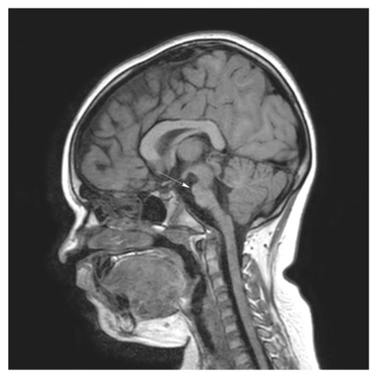Brain magnetic resonance imaging (MRI) demonstrated hypoplasia of the brainstem (Figure 2), a left thalamus volume larger than the right (Figure 3), an enlarged fourth ventricle, an anterior and posterior midline bulbar and pontine cleft (split-pons sign) (Figure 4), a butterfly configuration of the medulla (Figure 5), an occipital and parietal plagiocephaly on the right side, and a slight benign enlargement of the subarachnoid spaces in the frontotemporal area. There were no signal changes within the medulla or pons in any of the brain MRI sequences.