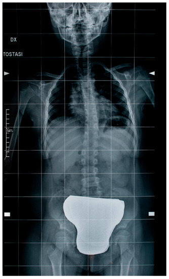 Orthopedic examination and standard X-rays of the spine revealed a scoliotic attitude or “pseudo scoliosis” of the dorsal–lumbar spine associated with unlevel shoulders and left thoracic hump with Risser Grade 0. No lumbar salience or vertebral rotation signs were found (Figure 6). Unfortunately, we have no data on how scoliosis has changed over time to determine its progression because of the family’s lack of cooperation in carrying out the periodic clinical and instrumental investigations that this case required.
