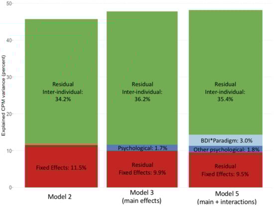 Variance decomposition while adding psychological factors to the model. Variance in CPM magnitude explained by Model 2 (including age, sex, repeat, CPM paradigm and CS intensity, but no psychological factors), Model 3 (additionally including psychological factors as main effects), and Model 5 (additionally including interactions of psychological factors with CPM paradigm). “*” denotes the interaction effect of two variables. Only inclusion of the interaction terms increased variance explained by the fixed effects, which was mainly due to the BDI*paradigm interaction. The variance explained by psychological factors in Models 3 and 5 was determined using Models 6 and 7, respectively (see Supplementary Table S3 for a full breakdown of fixed effects variance). Note that the figure only illustrates the variance explained by the fixed effects and the residual inter-individual variance. The remaining variance is unexplained and may be due, e.g., to between-session differences.