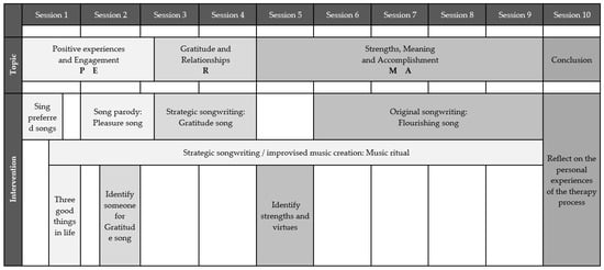 The overall aim of the intervention program is to decrease depressive symptoms and improve wellbeing by incorporating all facets of the PERMA model: positive emotion, engagement, relationships, meaning, and accomplishment. The ten-session individual therapy intervention is offered once a week for 45 min (a more detailed explanation of the program, including more songwriting techniques and background information will be included in a dissertation of the first author, which will be available through the University of Melbourne or by contacting the first author). If a session cannot take place at the scheduled time, the music therapist and songwriter can reschedule to the next available time, and at the very latest, to the regular scheduled time the following week. When this occurs, the duration of the entire program is extended until all ten sessions have been implemented. The songwriter is asked to complete three homework activities that take up to five minutes per day. If these tasks are not completed by the songwriter, this is discussed and completed with the music therapist at the beginning of the following session. Figure 1 details the focus and intervention content of each session.