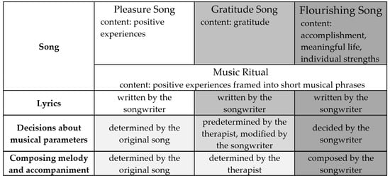 The steps of the therapeutic songwriting approach include the verbal introduction of the songwriting process, with a short musical example of the rewritten lyrics of a song/song part by the music therapist. Then, the songwriter can choose one of the songs that are already linked to positive emotions for the first song. As opposed to the “Song parody” therapeutic songwriting technique where the songwriter rewrites parts of or the whole lyrics of the existing song and the music therapist can offer the ‘song transformation’ method, here, the songwriter may also vary the melody and accompaniment if they wish [36]. This songwriting approach allows the songwriter to just focus on the lyrics without creating the music and allows for a gradual introduction to writing songs.